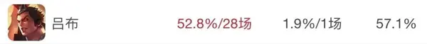 截止于昨晚,吕布在KPL的出场率为52.8%,胜率也高达57.1%,成功登顶职业赛事上的对抗路榜首位置。